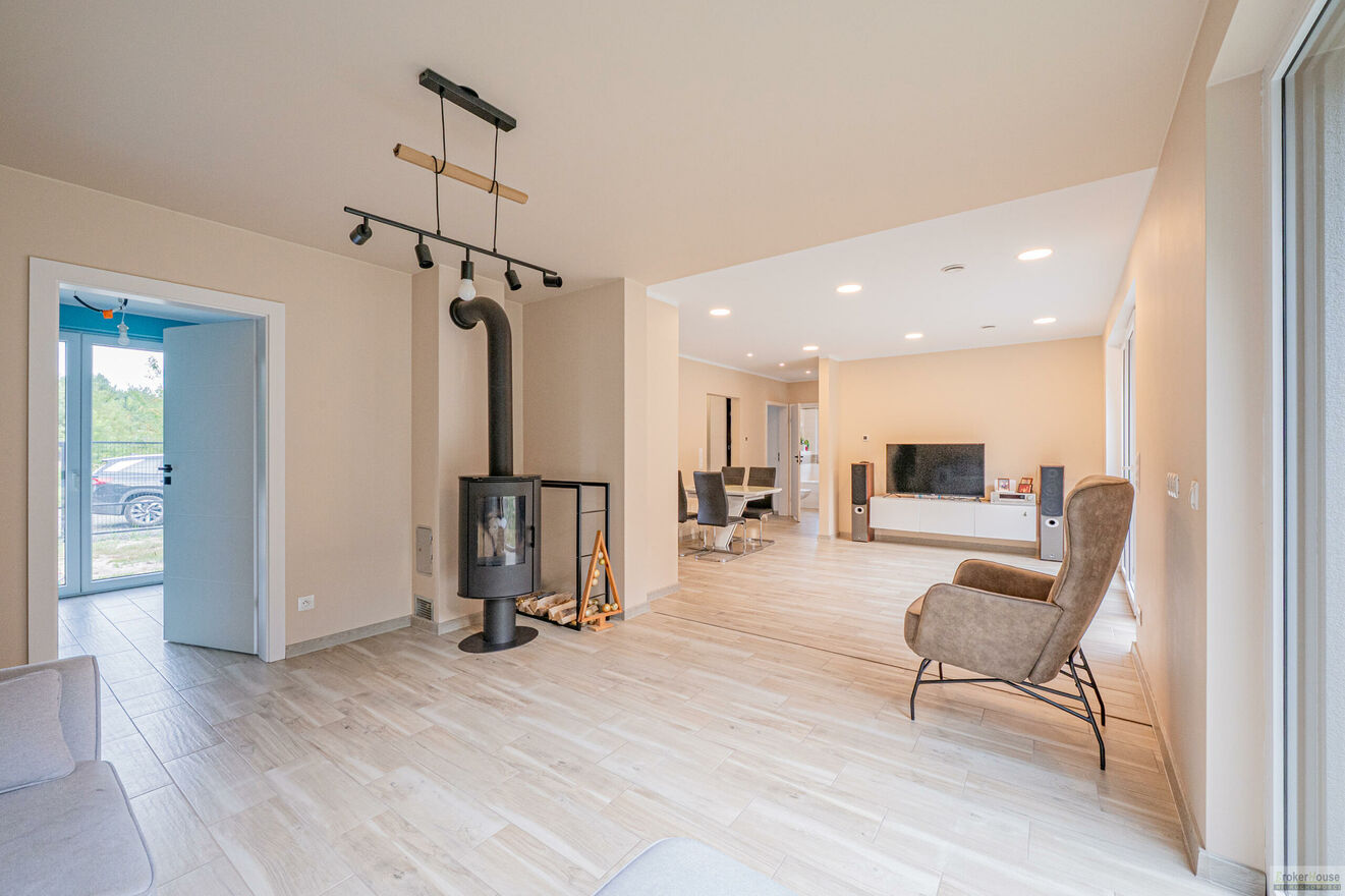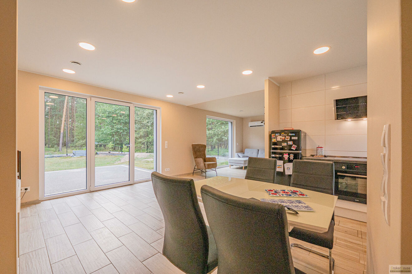 -otwarty duży salon z aneksem kuchennym oraz jadalnią,